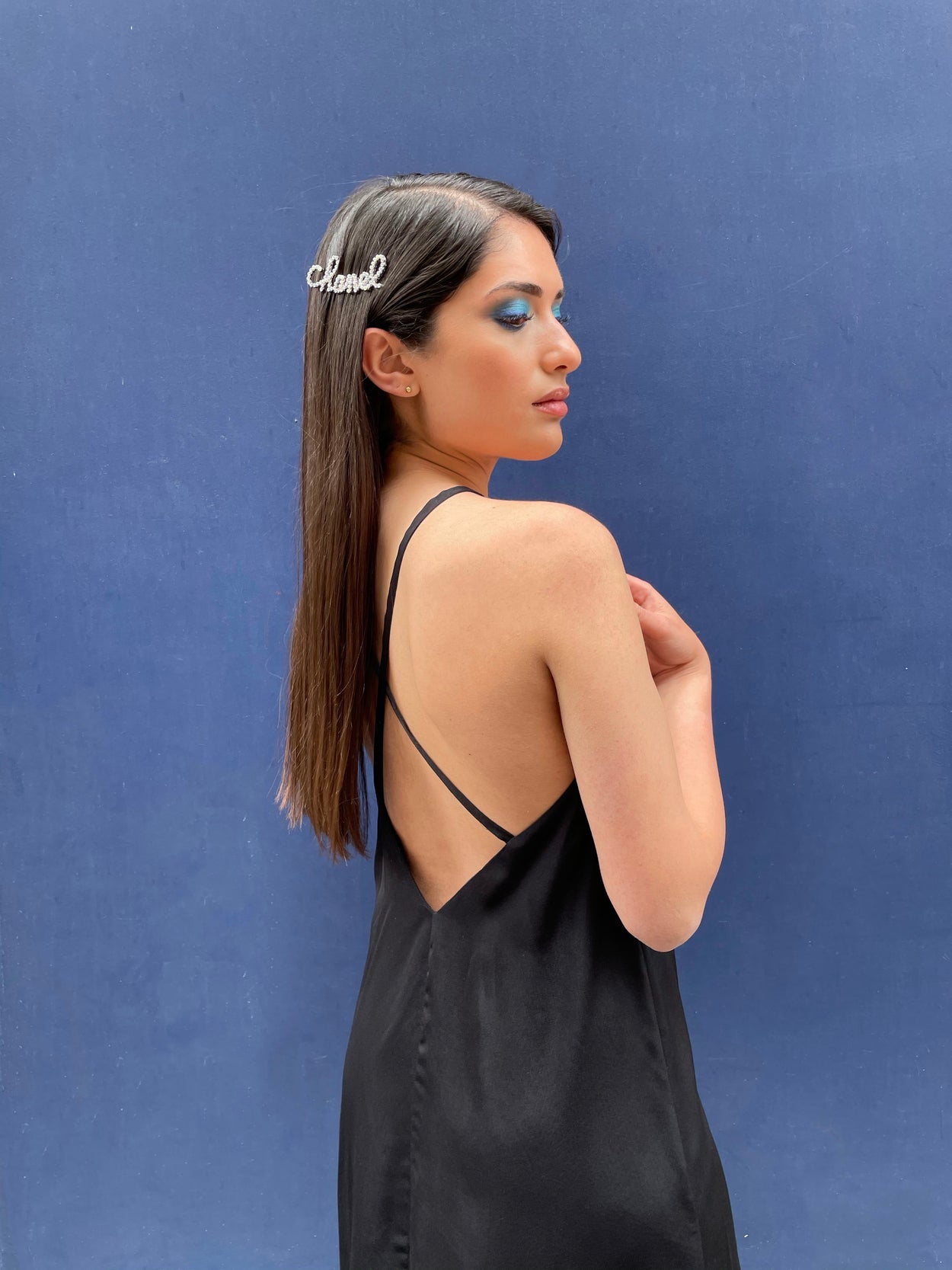 Ce bijoux de tête de la maison Chanel, est de couleur argenté orné de strass. Fourni dans une boîte noire sans griffe