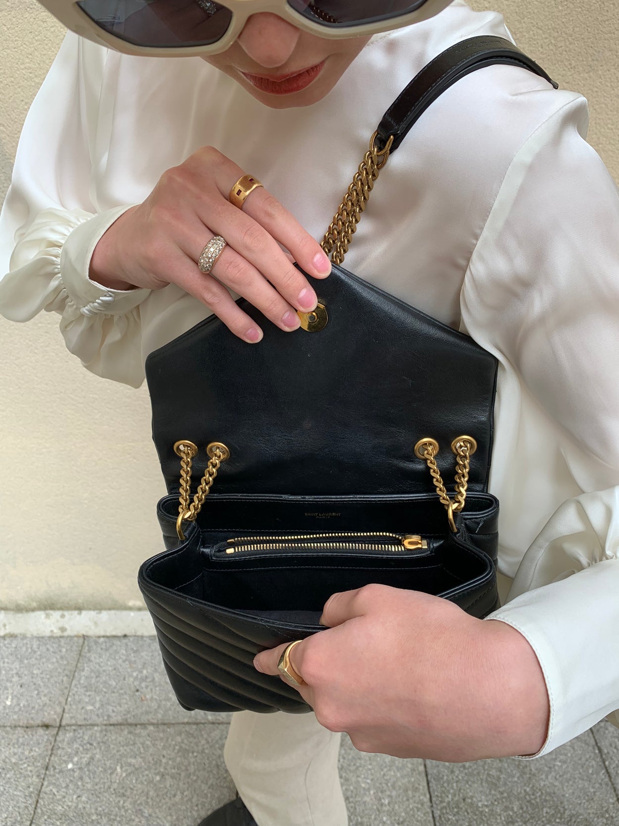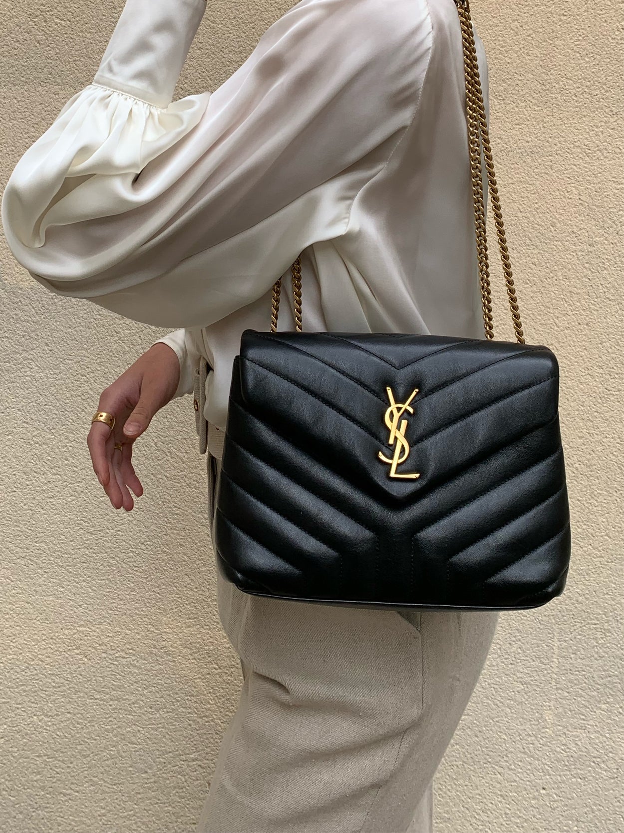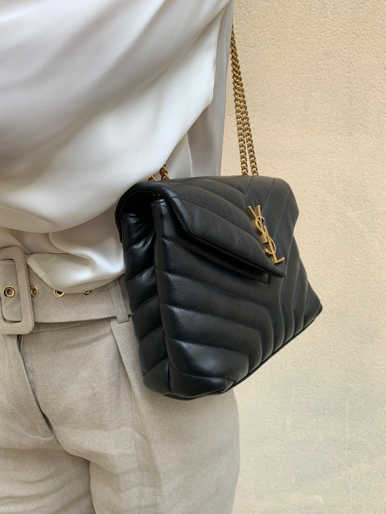 Modèle phare de la maison YSL. Loulou small chain bag en cuir lisse noir. Petit format mais grande contenance de part son intérieur profond et ses multiples rangements. Deux compartiments principaux divisés par un compartiment central zippé, une poche plaquée.